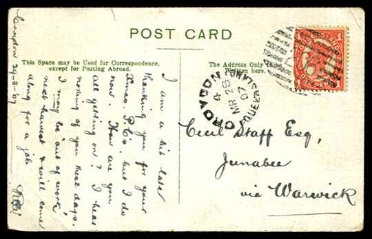 Croydon Sideface Barred Numeral Type 2a (7.5 mm) rated Common. Dated March 1907. Seen on Stampboards