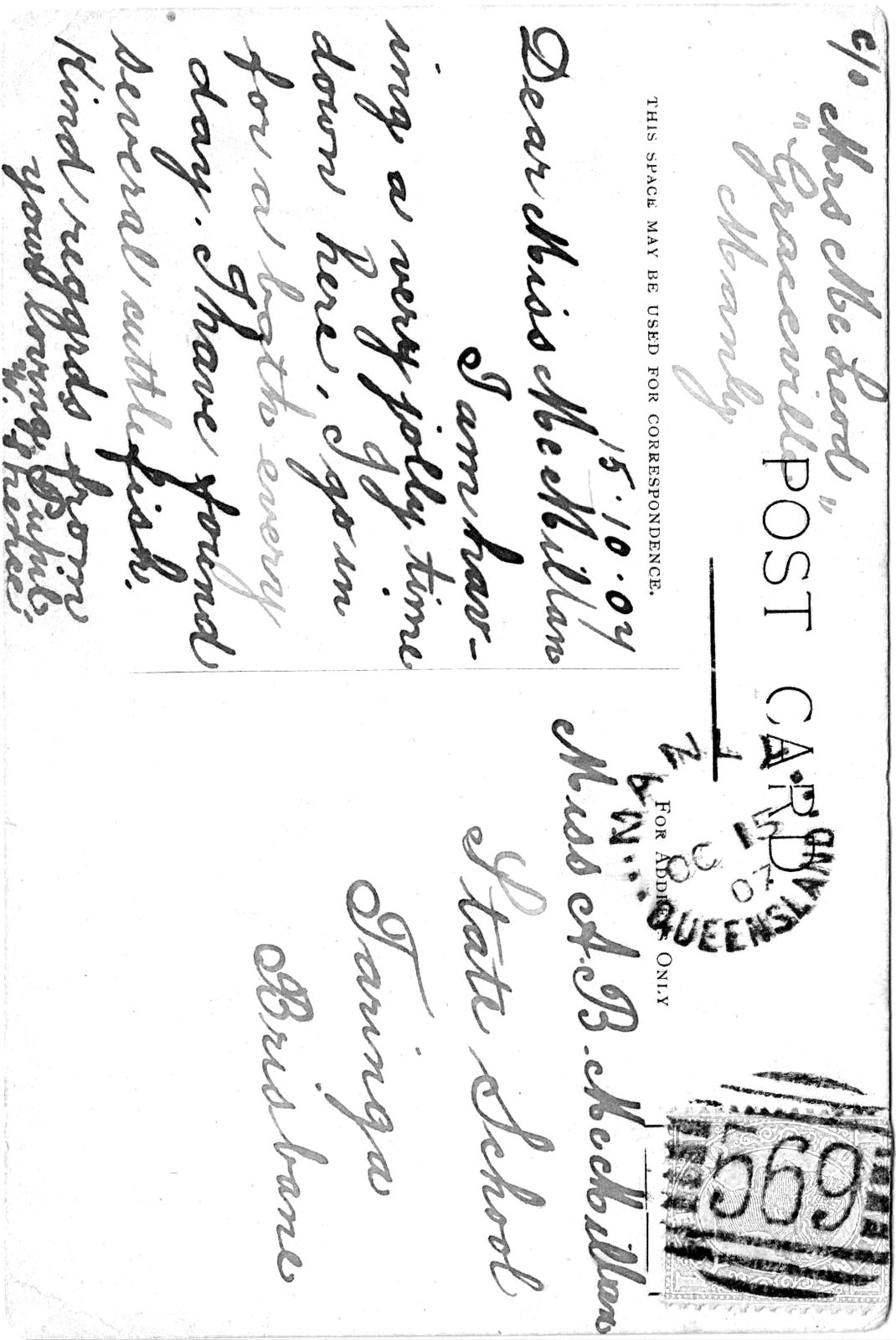 Manly Sideface Barred Numeral Type 2b (9.5 mm) rated Rare. Dated 15 October 1907. Seen in a private collection